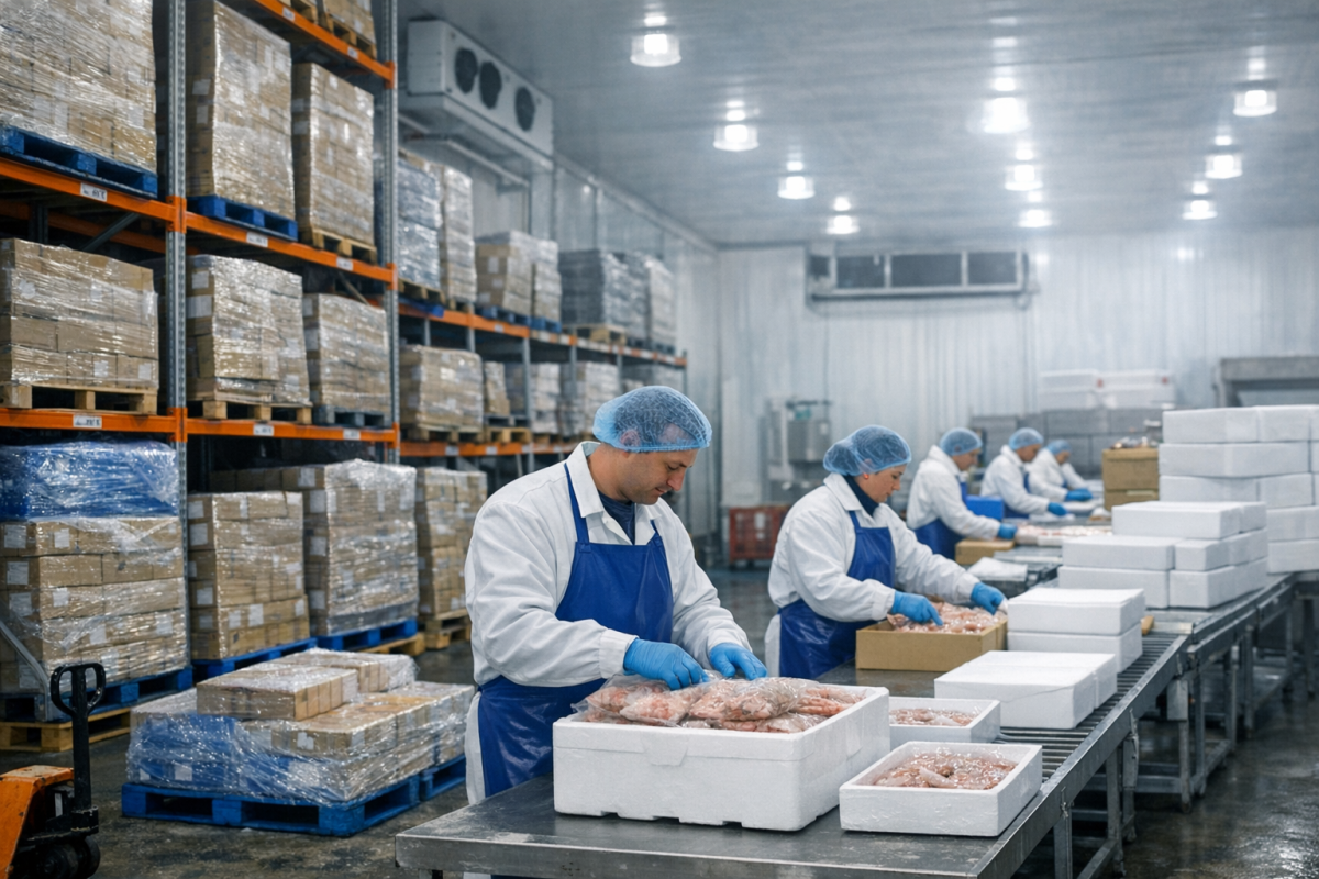 Productos del mar almacenados en instalaciones de congelación con control de temperatura.